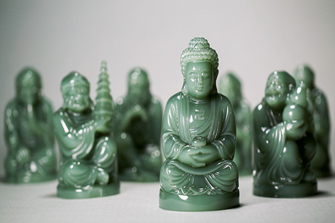 Bộ mười tám vị La Hán (đoàn tùy tùng của Đức Phật) này được chạm khắc từ nephrite jade xanh Siberia. Sự phân bố màu sắc của nephrite xanh Siberia chất lượng tốt nhất có thể cực kỳ đồng đều, không nhìn thấy các đốm đen trên các hình này.