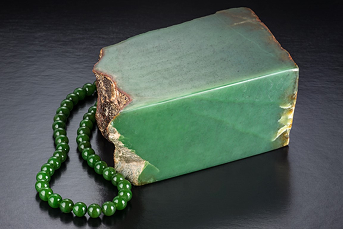 Các hạt trong chuỗi là từ Mỏ Polar ở British Columbia. Polar Jade được coi là sản lượng nephrite xanh tốt nhất của British Columbia. Hiện tại không có hoạt động khai thác nào diễn ra ở đó, khiến cho các mặt hàng có sẵn thậm chí còn có giá trị hơn. Phần thô là từ Wyoming, Hoa Kỳ, nơi khai thác cũng đã ngừng. Phần thô này đại diện cho vật liệu chất lượng tốt nhất của nó. Được cung cấp bởi Jade West Group.