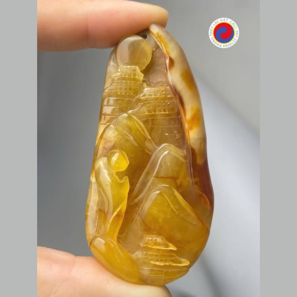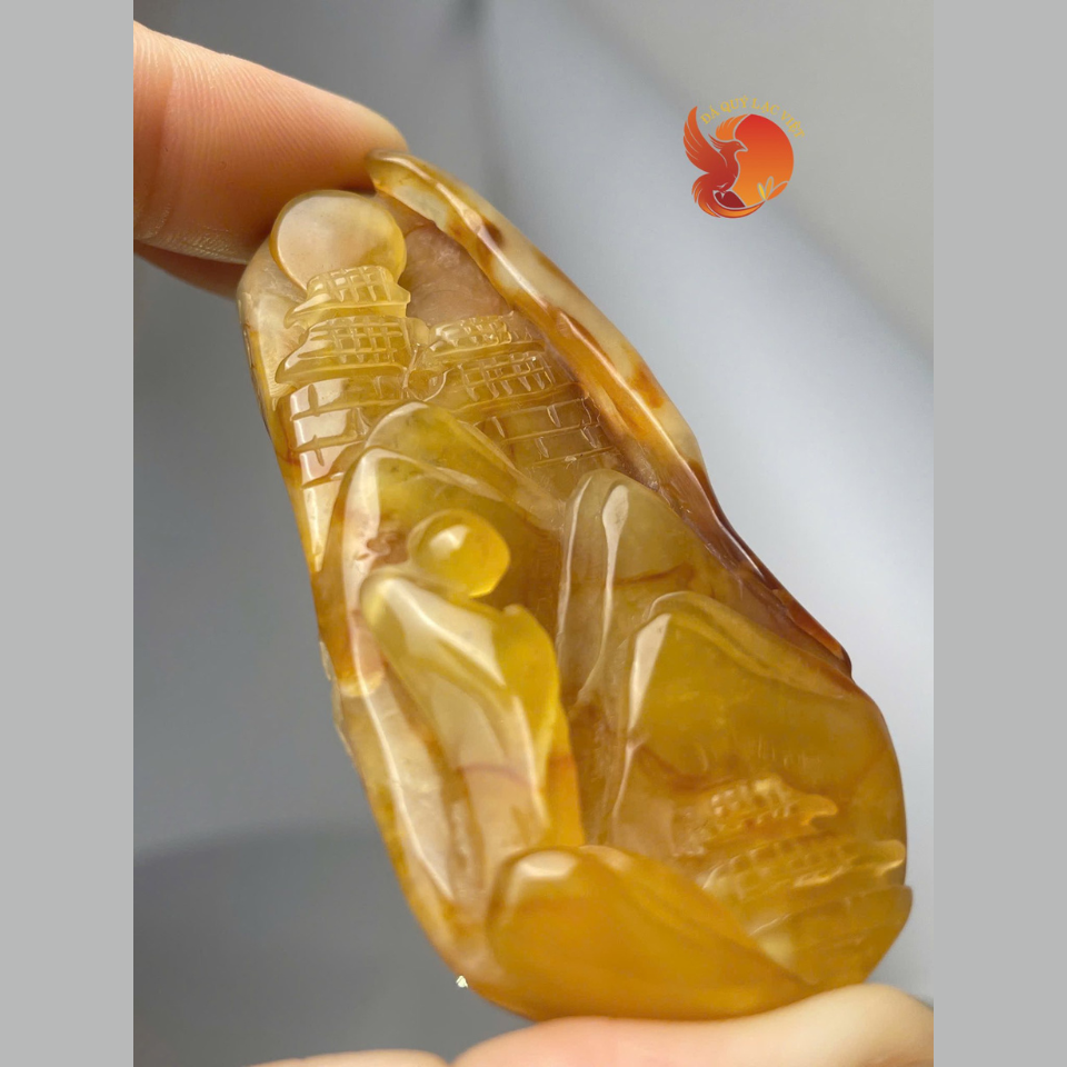 Trên nền ngọc sắc vàng mật ong trầm ấm, nghệ nhân đã khắc họa hình ảnh một người tu hành lặng lẽ hướng về đỉnh cao, nơi ẩn hiện đình đài thanh tịnh – tượng trưng cho cảnh giới minh triết và sự siêu thoát khỏi vòng đời tục lụy.