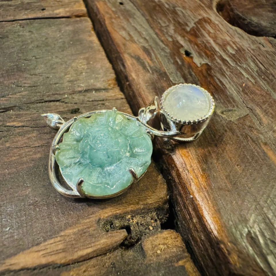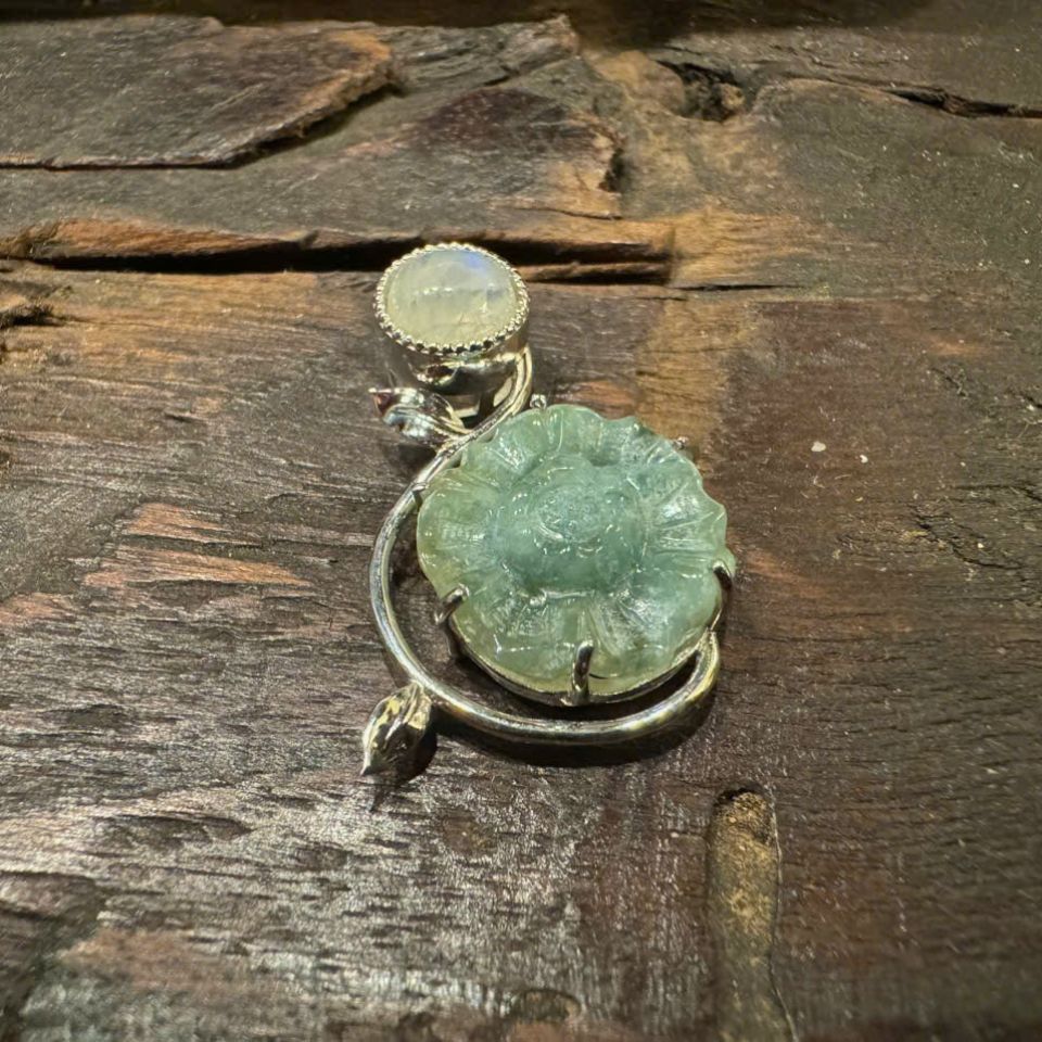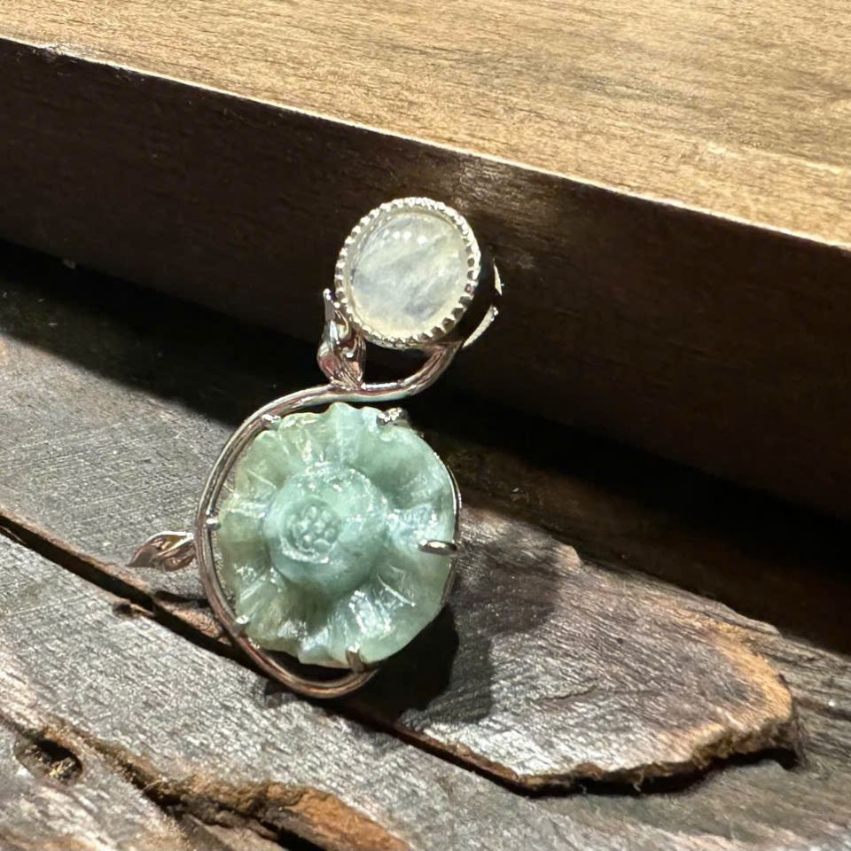 Sản phẩm Mặt Dây Chuyền Chạm Hoa Trà Xanh Nhạt có sự kết hợp của hai loại đá Moonstone: Moonstone màu xanh lá cây và Moonstone màu trắng