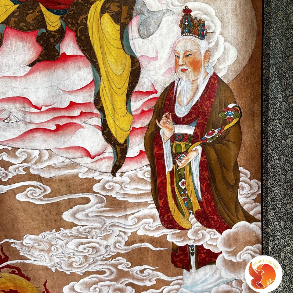 Hình tượng Lão Tử trong bức tranh được khắc họa với từng đường nét tinh tế, toát lên vẻ tiên phong đạo cốt, thể hiện sự giác ngộ Đại Đạo của vũ trụ – nơi thời gian và không gian là vô hạn, Đạo là Trời, Đức là Đất. Đây không chỉ là một tác phẩm nghệ thuật mà còn là vật phẩm phong thủy quý giá, mang lại sự thanh tịnh, cân bằng và trí tuệ cho không gian sống.