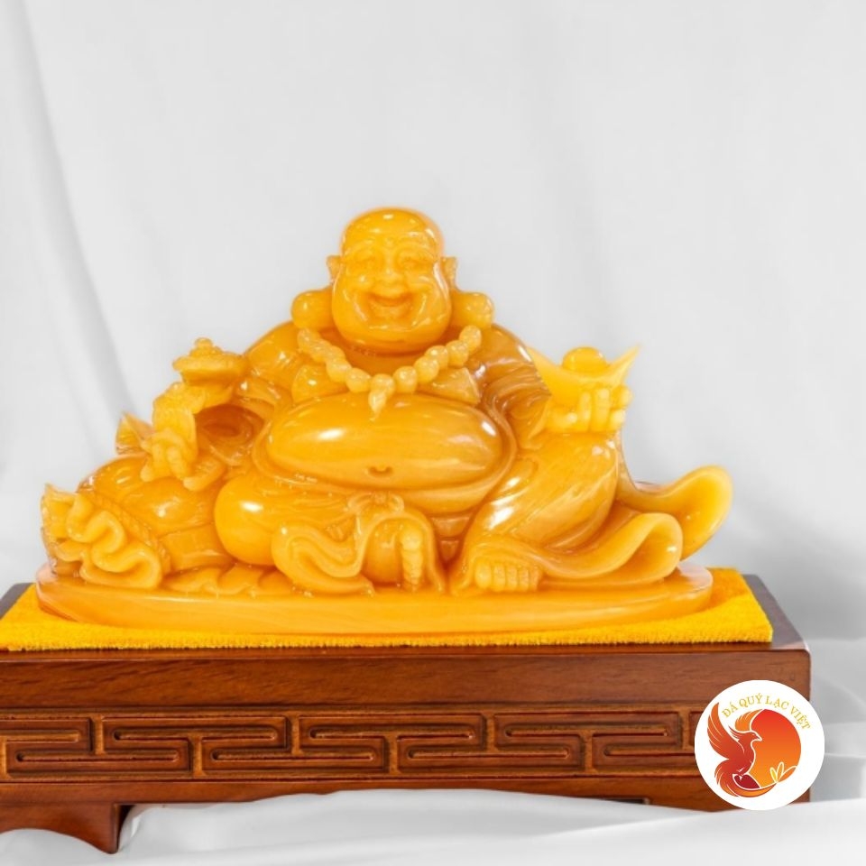 Ngọc Hoàng Long là một loại đá quý tự nhiên với màu vàng óng ánh, tượng trưng cho sự quyền quý, sung túc và thịnh vượng. Loại đá này không chỉ đẹp về mặt thẩm mỹ mà còn chứa đựng nguồn năng lượng mạnh mẽ, phù hợp để chế tác các vật phẩm phong thủy. Tượng Phật Di Lặc tại Shop Lạc Việt được làm từ ngọc Hoàng Long nguyên khối, được các nghệ nhân lành nghề chạm khắc tỉ mỉ, tạo nên một tác phẩm vừa sang trọng vừa mang ý nghĩa tâm linh sâu sắc.